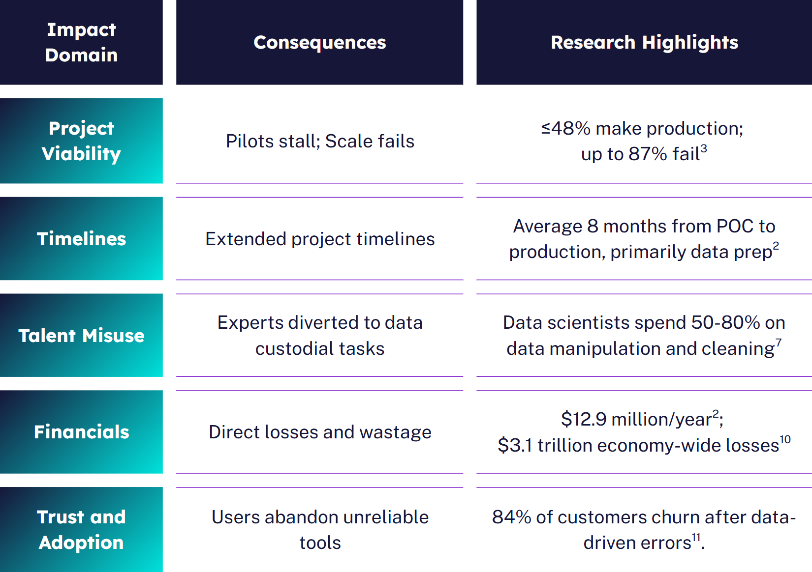 Up to 87% of AI projects fail to reach production,3 often due to poor, fragmented, or inconsistent data. Even surviving projects face long delays, with eight months on average spent preparing data instead of innovating. The costs are steep: $12.9 million in annual losses per organization,6 wasted expert time,7 and reputational damage from unreliable AI outputs.8,9